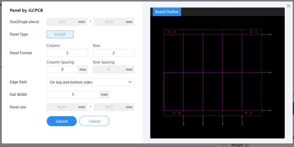 Bei den kleinen Abmessungen der Platinen und gerade dann, wenn man eine größere Stückzahl fertigen lässt (>= 50 Stück), empfiehlt es sich die Platinen auf Panels fertigen zu lassen (wählt Panel by JLCPCB). Beim Panel Typ „V-CUT“ können später die einzelnen Platinen ganz einfach auseinander gebrochen werden. Gebt beim Panel Format 5 Spalten und 2 Reihen an ohne Zwischenabstand (column/row spacing = 0 mm). Da ein Panel eine Mindestgröße haben muss (70×70 mm), ist hier zusätzlich ein 5 mm breiter Randstreifen oben und unten zu definieren (Edge Rails: On top and bottom size).