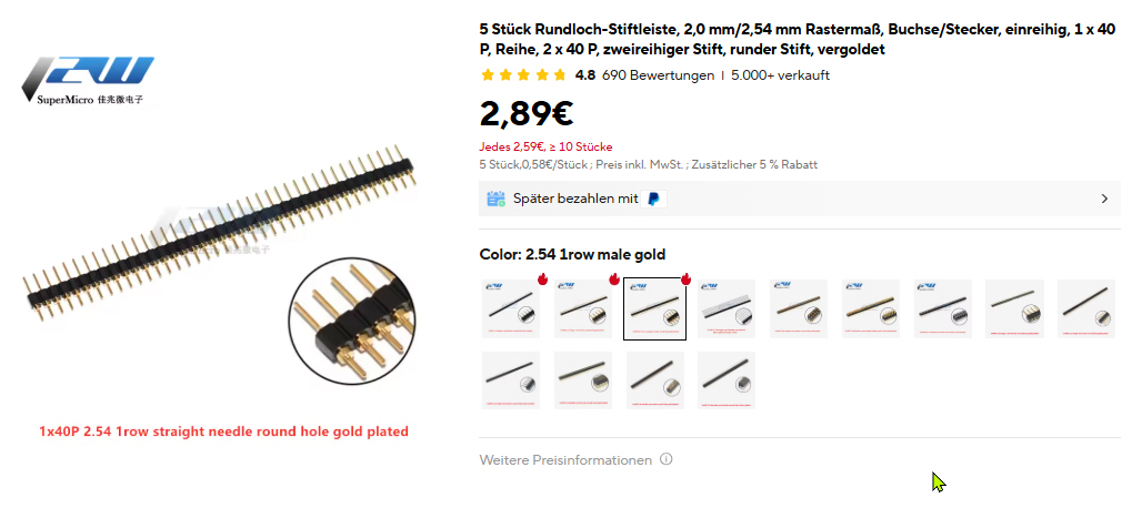 Die noch fehlenden Rundloch Stiftleiten können günstig bei AliExpress erworben werden.